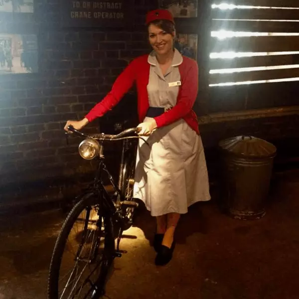 The exhibition features two of the original sets from the first Nonnatus House. It also features a series of props and costumes, all of which are authentic and have been used or worn by the cast - even down to a pair of long Johns’ which were worn by an extra are hanging up on the washing line! It’s always interesting watching people’s reactions to the props, especially the old-fashioned pram who many tell me they owned one similar! Occasionally I get asked to pose for a picture in the gallery which is usually with the bike!